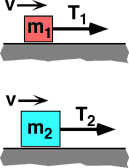 Two blocks with mass m2>m1 sit on a horizontal surface having friction. Both blocks are pulled with a constant speed, but v2 < v1, by a rope under tension. Which tension does the most work moving the block a distance D along the