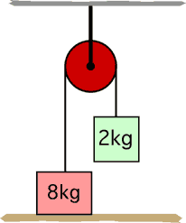 A string attached to an 8 kg mass is passed over a frictionless pulley and attached to a 2 kg mass as shown. What is the tension in the rope supporting the pulley? (Use g=10 N/kg)